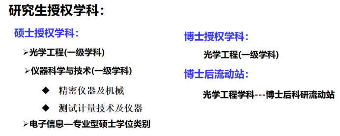 学院拥有光学工程博士学位授权一级学科及博士后科研流动站,两个硕士学位授权一级学科(光学工程、仪器科学与技术),一个专业硕士授权类别(电子信息);其中光学工程学科是省级重点学科,2014年光学工程学科获批陕西省普通高等学校优势学科立项建设项目、2014年获批陕西省研究生联合培养示范工作站、2017年以优异成绩通过光学工程学科博士学位授权点专项评估、同年获批国家国防特色学科并入选省“国内一流学科建设高校”建设学科;上榜“2022软科中国最好学科排名软科”学科排名前20%。