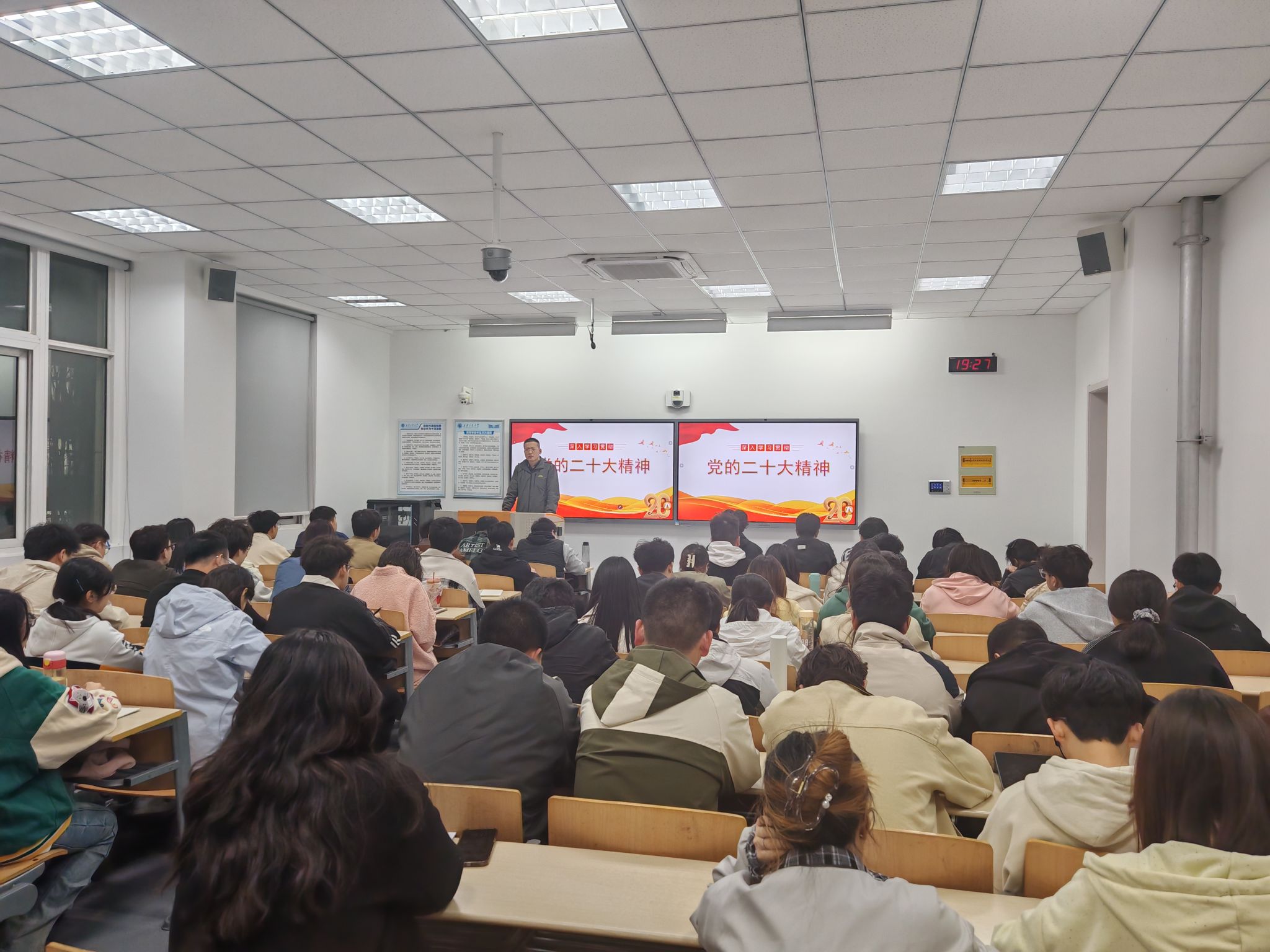 永利23411集团组织员乔海东以“深入贯彻党的二十大精神”为题,进行第一讲。他从关键时刻召开的十分重要的会议、党的二十大报告的主要内容核心要义、全面学习贯彻党的二十大精神三方面进行全面解读。他希望同学们提高政治站位,衷心拥护“两个确立”,增强“四个意识”,坚定“四个自信”,做到“两个维护”,深入学习宣传贯彻党的二十大精神,认真学习研读原文,准确把握精神实质,深入了解其内涵和意义,弘扬伟大建党精神,把学习党的二十大精神的成果转化为奋进新征程、建功新时代的实际行动。