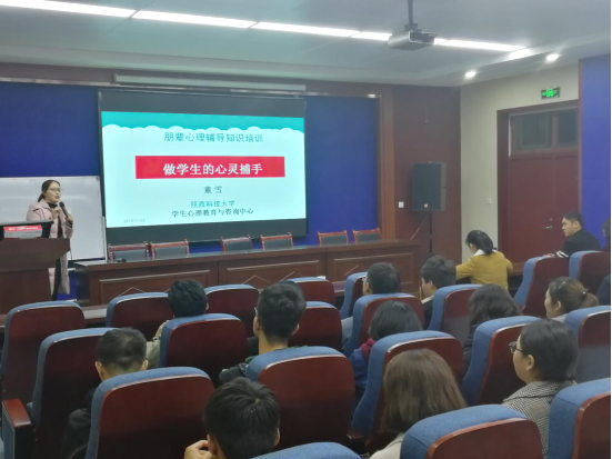 本次培训主题是:做学生的心灵捕手,主讲老师仍是邀请的陕西科技大学学生心理健康教育与咨询中心主任董雪副教授。2017级全体心理委员及宿舍心理信息员共计126人参加了培训。