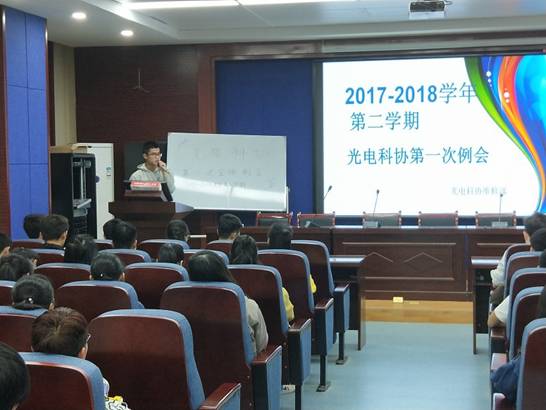 314晚我院科协在工六402成功召开了2017—2018学年第二学期第一次例会。参加本次会议的有光电科协主席团、各部门部长以及科协全体干事。本次例会由科协主席郭胜飞主持。