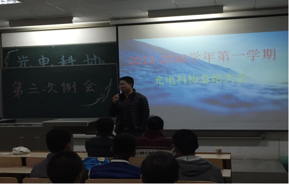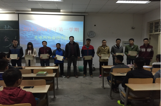 会上,院科协主席高祥首先对2015-2016第一学期科协的工作进行了总结,对今后的工作提出了努力方向。对在工作中表现优异的个人和集体进行了表彰,李睿老师给他们颁发了证书及奖品。随后,科协各部长对本学期的工作分别进行了汇报,并提出了下一步的工作思路。各部门干事的代表也分别谈了在科协这一学期的收获与感受。最后李老师总结发言,对科协本学期的工作给予了充分的肯定,他说,科协的各部门能够尽职尽职做好本职工作,在各部门团结协作,共同努力下,学院的科协工作取得了一些的成绩,如高祥同学在2015年第十届全国大学生“飞思卡尔”杯智能汽车竞赛中获得三等奖。何生君,宋娇,唐莉在陕西省”光电杯“光电信息创新创意大赛中获得二等奖等,这些成绩的取得会加更激励科协今后的工作。还成功举办了“金秋文化节 点亮西工”大型LED灯展等大型活动,师生反响良好。他同时还指出,科协工作还有一些不足,今后需要改进和完善的地方,如要强化专业知识,积极拓宽思路,用于开拓创新。希望各部门发扬优点、弥补不足,不断总结提高,争取在以后的工作中取得更优异的成绩。