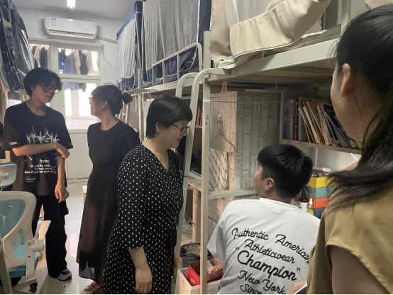 宿舍是学生们的“校园家”,直接影响学生们的学习、生活质量。杨利红进入宿舍后,先对宿舍水电、门窗、床柜、空调等基础设施进行查看,充分确认宿舍安全。对于存在的卫生死角或安全隐患设施,及时给学生指出问题并提出整改意见,确保同学们学习生活环境舒适、安全。