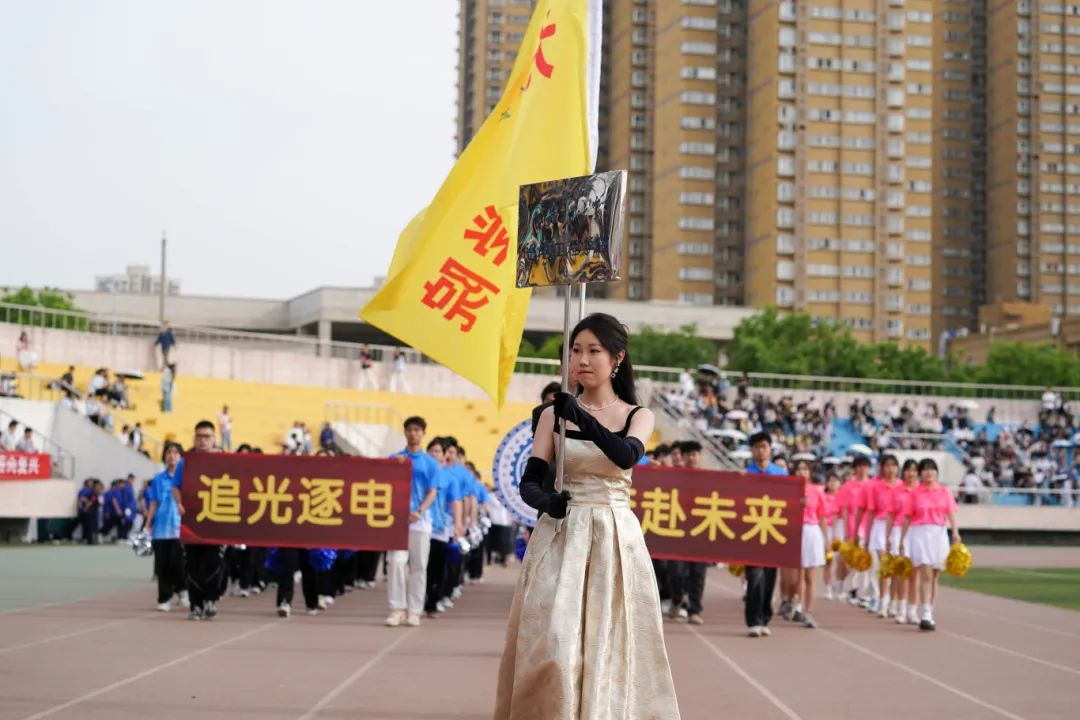 开幕式上,光电方阵以极具学科特色的"追光者"造型惊艳全场。方阵队员步伐整齐划一,手中挥舞的金、蓝花球交相辉映,充分展现出光电学子朝气蓬勃、锐意进取的精神风貌,赢得了现场观众的阵阵掌声。