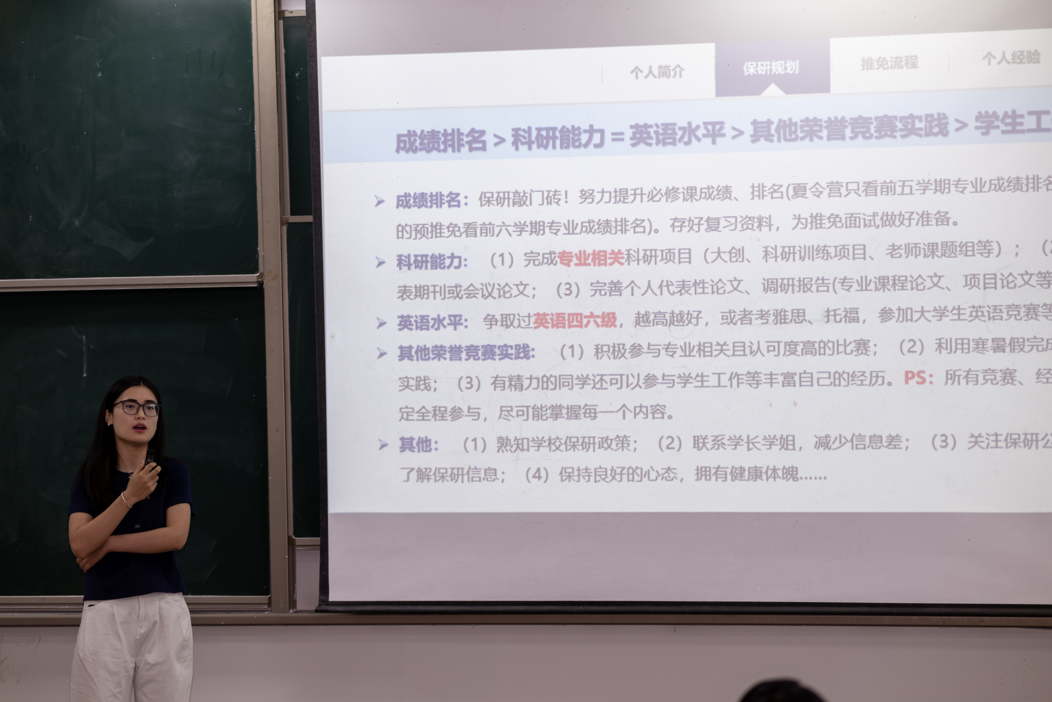 杜凯兴以“保研全流程解析”为主题,结合自身经历系统梳理了保研的核心环节。他重点分享了如何从大一开始进行学业与综合素质的“双轨规划”,强调“信息差决定成败”,并推荐了高效的信息收集渠道和文件整理工具。针对面试环节,她通过模拟问答展示了逻辑表达与专业素养的打磨技巧,提醒学弟学妹“早准备、多演练、善复盘”。
