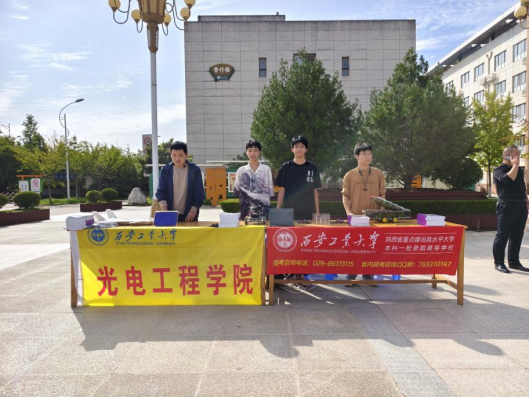 活动16:30开幕,电子狗表演后,各校展位人气渐旺。西安工大展区以“军民融合·创新未来”为主题,展出旋转LED、激光小车等互动装置,吸引学生争相体验。展品融合科技与趣味,配合师生专业讲解,生动展现了国防科技魅力。