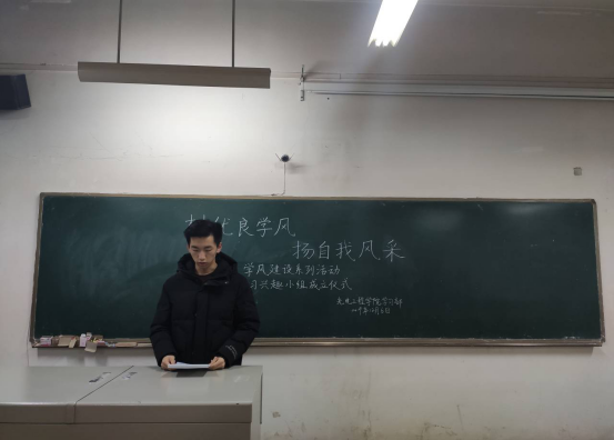 首先,学习部部长张宇诺对兴趣小组进行了简要介绍。接着,孙老师发表讲话,他指出优良学风是激励学生奋发向上、努力成才的无形而强大的精神力量,是提高育人质量的重要保证。针对我院学风建设的实际情况,我院团委特制定了本次兴趣学习小组的活动方案。他希望通过组织学习,使每个学生能够对照学习规范,反省不足、改正缺点。兴趣小组由学习部负责管理,避免出现与学习无关的话题,并且定期推送学习技巧,帮助大家更快适应大学的学习节奏,希望大家能够在期末取得好成绩。最后,参与活动人员合影留念。