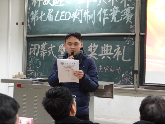 12月12日,由我院团委主办,科协承办的第七届“科技辉映,辉映未来”LED灯制作竞赛颁奖典礼暨闭幕式在教1—201成功举办。出席本次闭幕式的有永利23411集团团委书记朱先彬,光电学院实验室老师褚渊博,2017级辅导员孙君和光电科协主席团成员。闭幕式由张嘉懿主持。