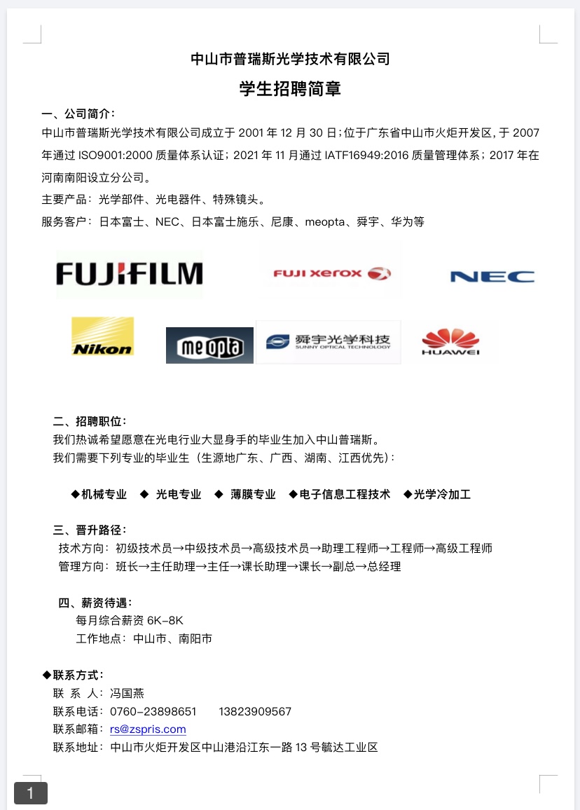 普瑞斯光学技术有限公司招聘