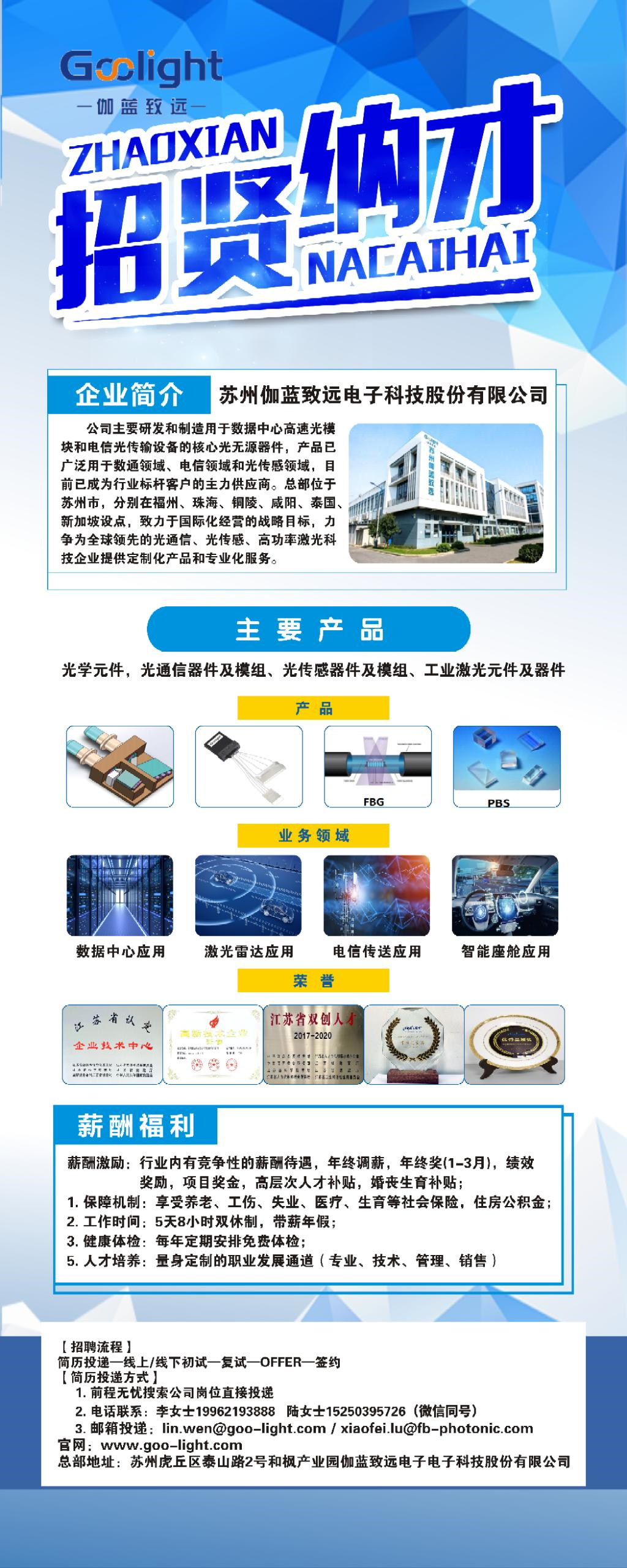 【企业简介】:公司主要研发和制造用于数据中心高速光模块和电信光传输设备的核心光无源器件,产品已广泛用于数通领域、电信领域和光传感领域,目前已成为行业标杆客户的主力供应商。总部位于苏州市,分别在福州、珠海、铜陵、咸阳、泰国、新加坡设点,致力于国际化经营的战略目标。