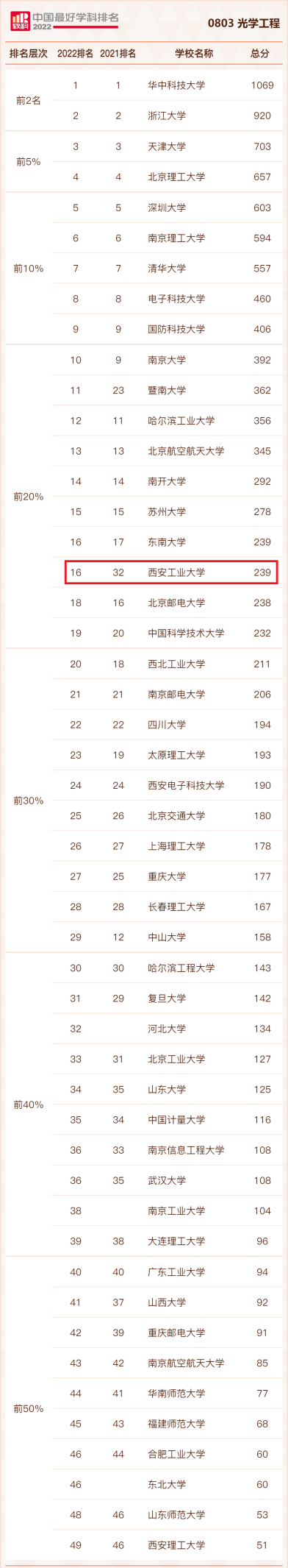 2022年9月21日,高等教育评价专业机构软科今日正式发布“2022软科中国最好学科排名”。光学工程学科共有49所大学上榜。永利yl23411集团的“光学工程”学科,位居全国第16位,学科排名前20%。