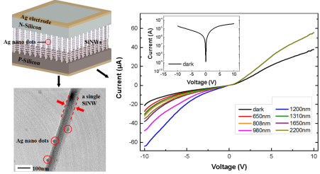 以硅材料为基础的光电探测器与CMOS工艺高度兼容,具备片上规模集成器件的潜力。但晶体硅由于自身性能缺陷(禁带宽度1.12eV),即硅对波长大于1100nm的红外光几乎无法吸收,这就对硅基光电探测器的红外工作波段、灵敏度产生了极大的限制。那么如何来拓宽波长响应范围成为该领域所面临的挑战。在本次工作中,梁海锋教授课题组利用焦耳热焊接,制备了尖端对尖端互连的p-n结硅纳米线光电探测器,结合宏观的材料器件光电性能测试,提出了宽光谱响应的物理机制模型。实验表明,该器件可以实现可见-近红外-短波红外(650-2200nm)宽光谱范围的光探测,由于超低的暗电流和较高的光响应,归一化开关比达到1048.6,器件响应度和归一化探测率分别在偏压5V、0V下达到最大值25.11mA/W、1.03×1010cm HZ1/2W-1。最后我们提出了一种光电流模型机制来证实该器件的高开关比和宽光谱响应性能:尖端对尖端互连的p型和n型硅纳米线在界面形成了p-n结,带隙内光生载流子在内建电场作用下有效分离产生光电流;p型硅纳米线与银纳米颗粒形成肖特基势垒,当银纳米颗粒受光激发时产生的等离子体热电子克服肖特基势垒,注入p型硅纳米线的导带,进而拓宽了探测器的红外波段响应范围。