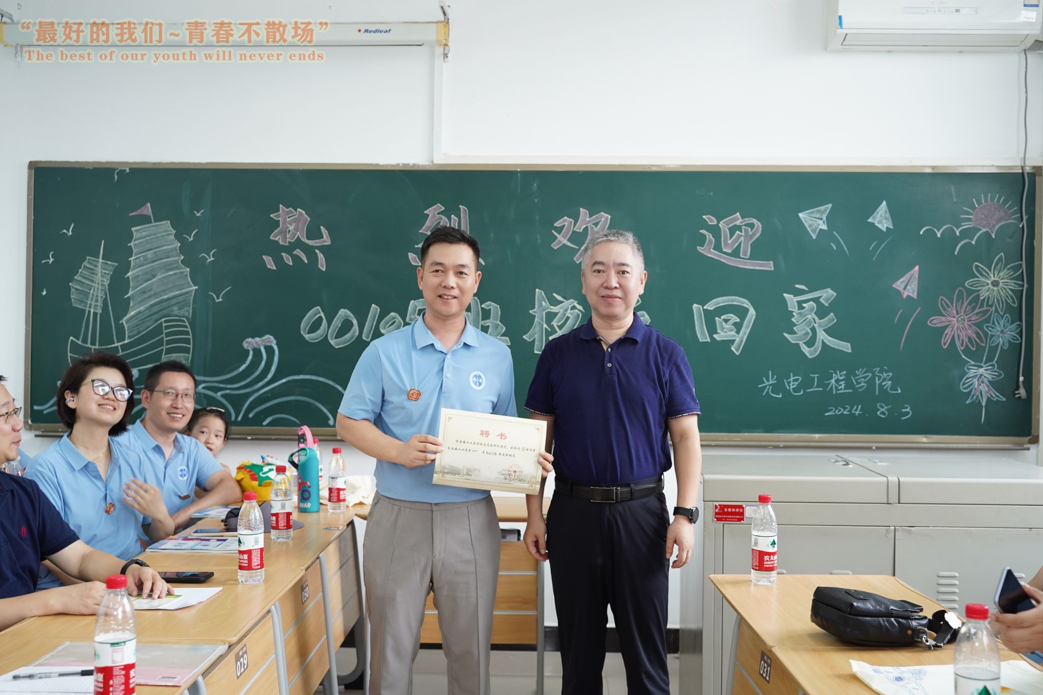 王守民为校友侯坤颁发了校友联络员证书,表彰他在联系和服务校友方面所做出的努力,并合影留念。