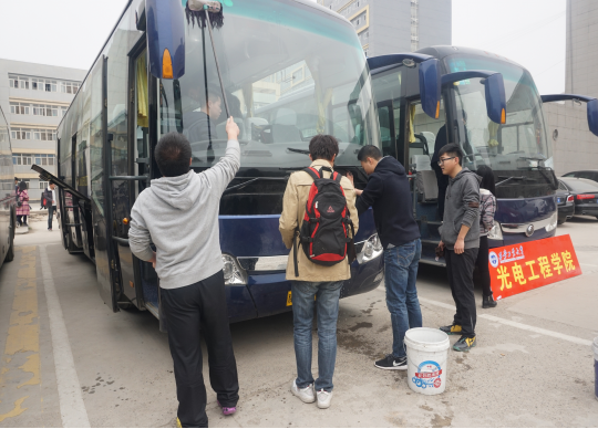 学生会的志愿者们准时到停车场,大家分工合作,有的打扫车里卫生,有的擦车外面,每一位志愿者都热情积极的行动起来,经过1个多小时的清洁5辆校车焕然一新。活动受到了车队师傅的高度赞扬。