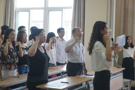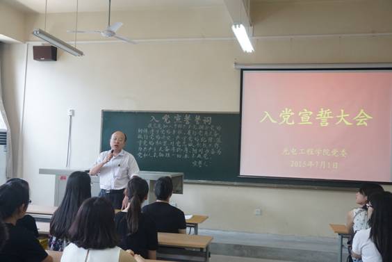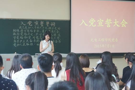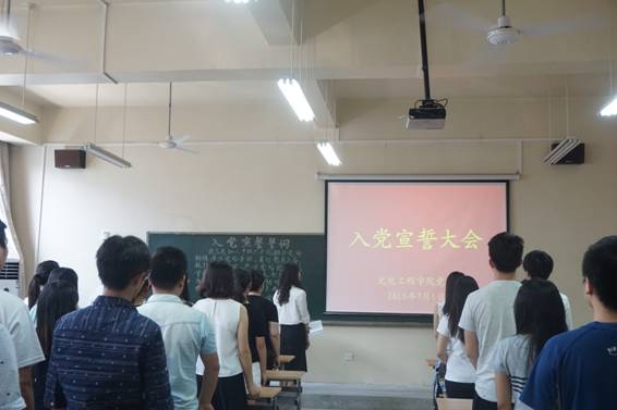 为庆祝中国共产党成立94周年,进一步增强学生党员党性意识,7月1日,永利23411集团党委在未央校区工6-402教室隆重举行了入党宣誓大会。院党委书记弥谦、副书记陈彤,各学生党支部书记,42名新发展的党员及部分学生党员代表参加了仪式。