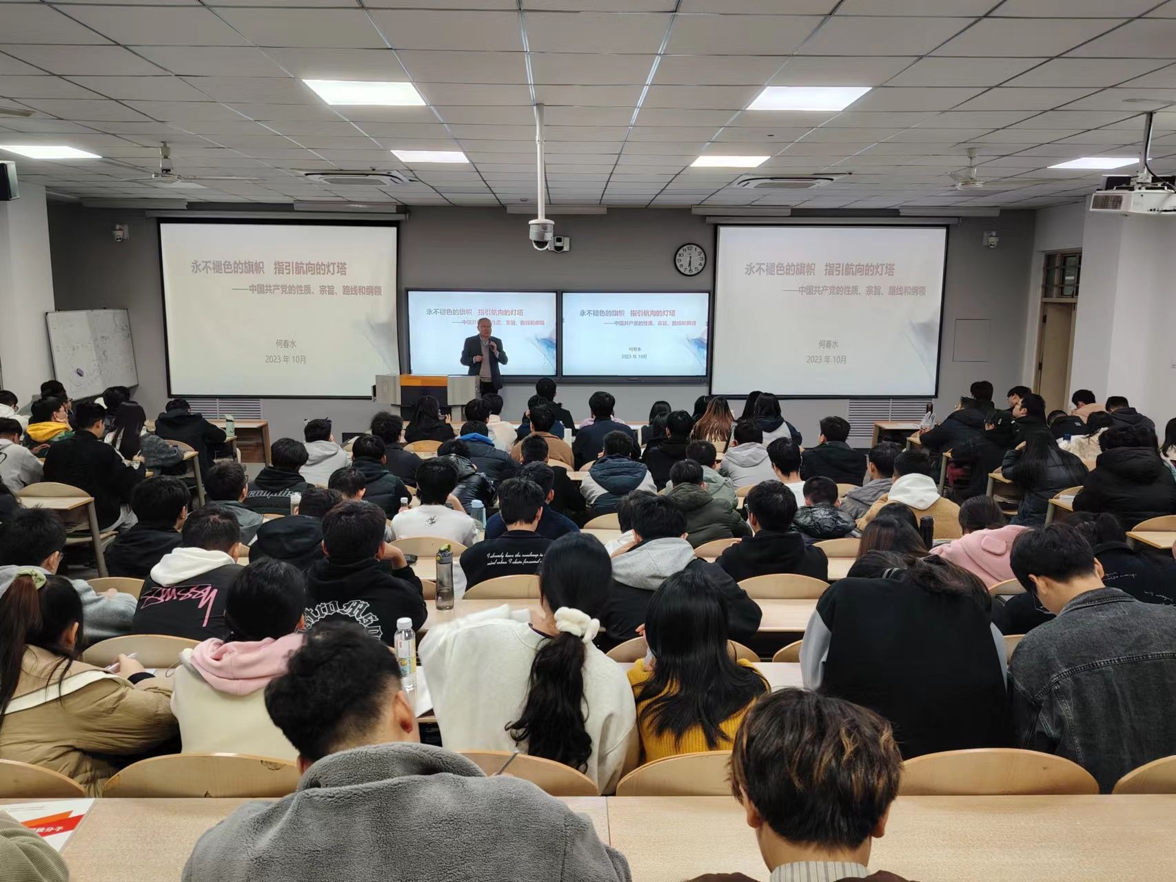何春水老师系统讲授了中国共产党的性质、宗旨、路线和纲领,重点介绍政党、共产党、中国共产党和青年学生的历史责任和担当等方面的知识。他指出,中华民族是历经磨难、不屈不挠的伟大民族,中国人民是勤劳勇敢、自强不息的伟大人民,中国共产党是敢于斗争、敢于胜利的伟大政党。他强调了新时代青年的历史担当与责任,希望大家增强⼊党的自觉意识,端正入党动机,提高知识理论水平,坚定理想信念,让自己始终保持积极向上的精神状态。