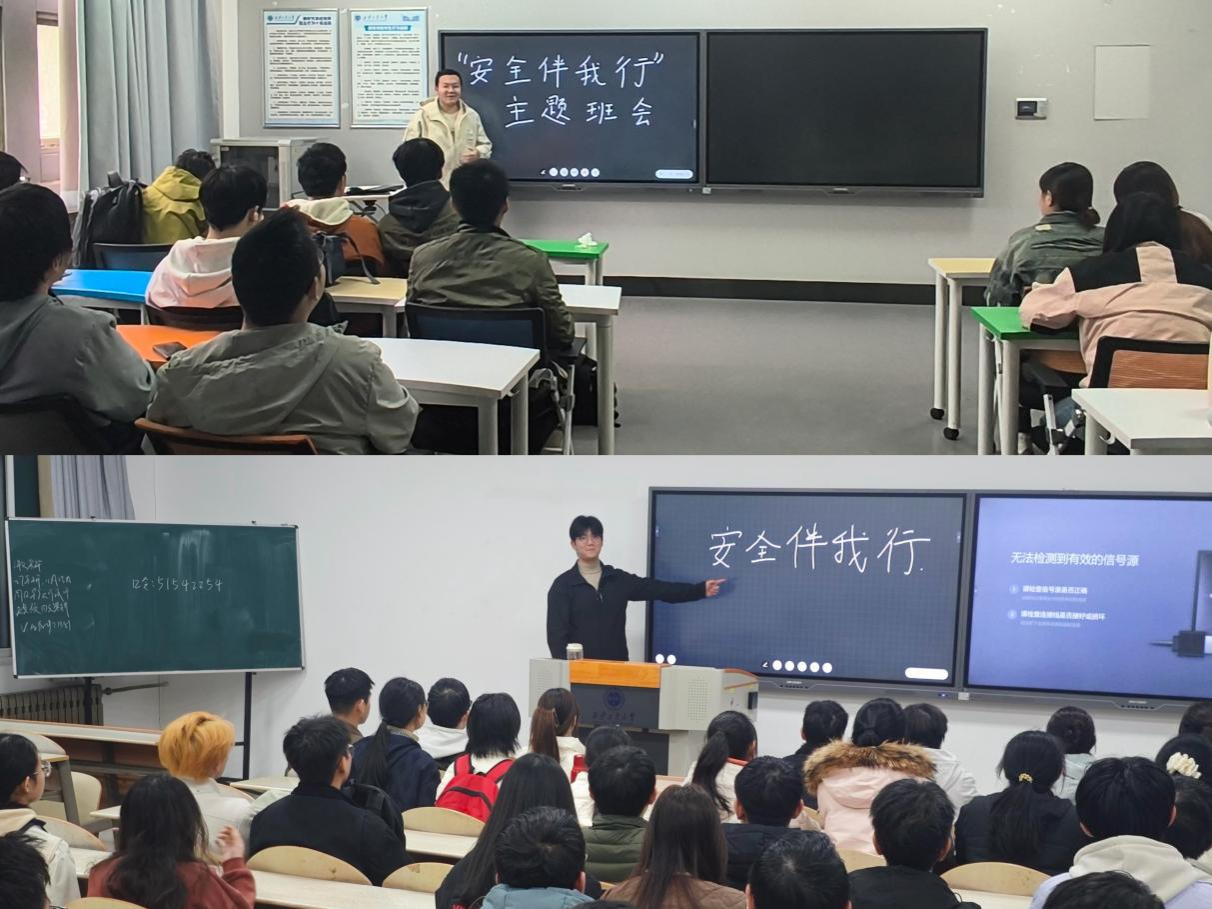 主题班会主会场以“安全无小事,防患于未然”为核心,通过PPT演示、案例解读等形式,系统讲解了校园安全的重要性。24010712班聚焦网络安全,梳理电信诈骗、网络刷单、游戏交易诈骗等常见陷阱,用近期发生的真实案例敲响警钟;24010611班围绕宿舍安全,重点强调用电规范、消防安全等注意事项,通过安全纪录片演示灭火器使用方法与火灾逃生技巧;24010713班关注心理健康与求职安全,针对新生适应期心理困惑提供疏导方法,提醒学生警惕求职中的虚假招聘、信息泄露等风险。此外,部分班级组织火灾预防专题分享和电信诈骗短片观影活动,通过沉浸式体验让安全知识入脑入心。其余班级还通过实验室安全知识问答、情景模拟等形式,进一步巩固了学习成果,让安全理念在互动中深化。